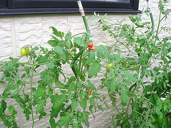和室前の小っちゃな花壇に植えた、ミニトマト。