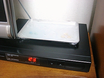種を置いてラップしてチン、こんな感じでTV用端末機器の上で温めます。