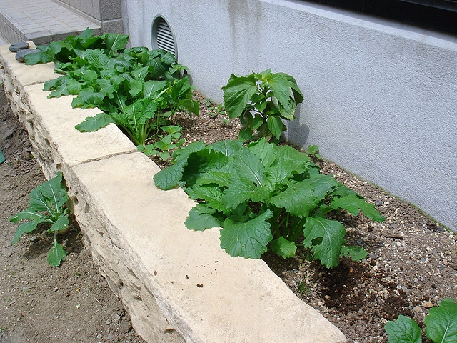 左手プランターがコマツナなばな。