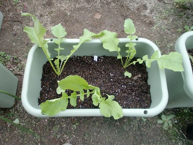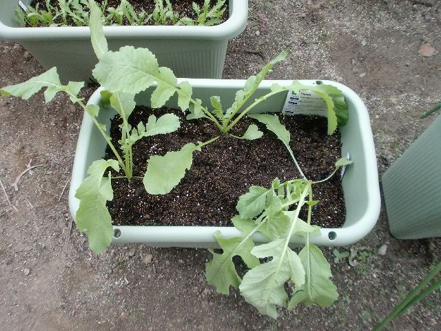 右側にはミニカリフラワー4株、コールラビ・ビアンコ3株
